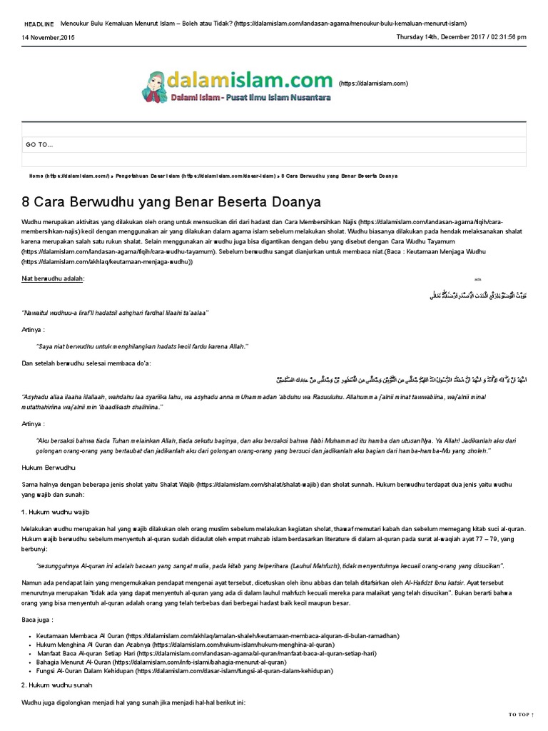 Oleh karena itu, wudhu menjadi ibadah yang sangat penting bagi orang islam yang mana kita diwajibkan untuk mengerti dan. Sebab tujuan wudhu' adalah bersuci, maka makruh hukumnya berwudhu tidak tempat yang tidak suci. Ketika membasuh wajah saat wudhu, hendaknya membasuh secara keseluruhan atau dilebihkan dari. Semua bacaan niat wudhu dan doa selepas wuduk dipermudahkan dengan tulisan rumi. Panduan cara ambil wudhu yang betul & sempurna.